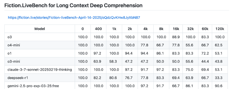 Der wohl interessanteste o3-Benchmark ist die Ausperformance bei der Verarbeitung langer Kontexte. Bei 128K Token (etwa 96.000 Wörter) von maximal 200K Token erreicht o3 im Fiction.live-Benchmark als erstes Modell 100 Prozent – das ist vielversprechend für KI-Anwendungen mit sehr langen Texten. Nur Googles Gemini 2.5 Pro kann mithalten und kommt auf 90,6 Prozent. o3-mini und o4-mini fallen deutlich ab. Fiction.LiveBench prüft, wie gut KI-Modelle komplexe Geschichten und Zusammenhänge bei sehr langen Texten komplett verstehen und korrekt wiedergeben. Ein Negativbeispiel ist Metas Llama 4, das zwar mit einem Kontextfenster von bis zu zehn Millionen Token wirbt, das aber über eine einfache Wortsuche hinaus kaum brauchbar ist.