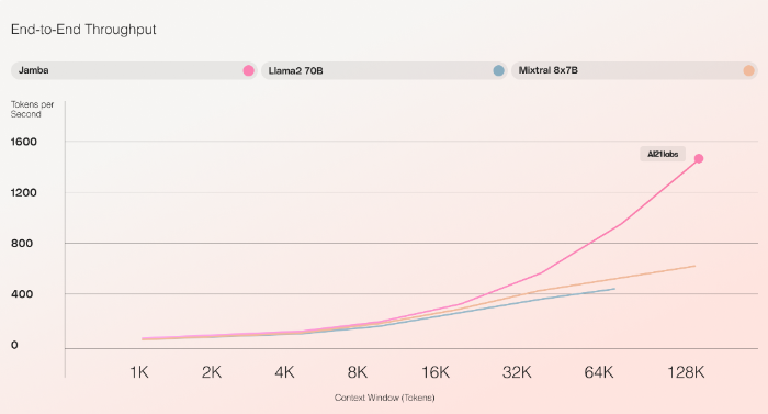 Laut AI21 ist Jamba der erste hybride SSM-Transformer, der auf Produktionsgröße skaliert wurde. Er bietet ein Kontextfenster von 256.000 Token und soll in ersten Tests eine dreimal höhere Verarbeitungsgeschwindigkeit für lange Kontexte erreichen als der Mixtral 8x7B Transformer. Jamba schafft ca. 1600 Token pro Sekunde, Mixtral ca. 550.