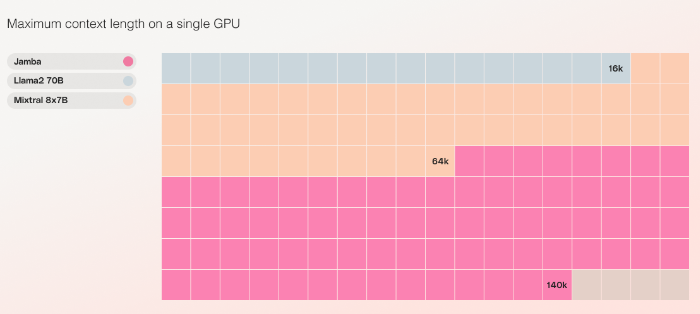 Jamba verwendet zwölf Milliarden seiner insgesamt 52 Milliarden Parameter zur Inferenz und soll diese effizienter nutzen als ein reines Transformer-Modell vergleichbarer Größe. Die zusätzlichen Parameter erhöhen die Leistungsfähigkeit des Modells, ohne den Rechenaufwand entsprechend zu erhöhen. Als bisher einziges Modell seiner Größenklasse soll Jamba bis zu 140.000 Token Kontext auf einer einzigen 80 GB High-End-GPU verarbeiten können.