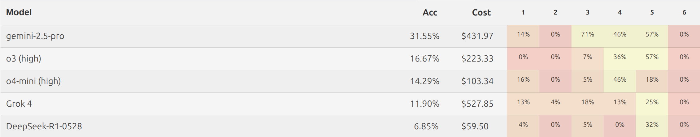 Die Plattform MathArena.ai bewertete mehrere führende Sprachmodelle – darunter Gemini 2.5 Pro, Grok-4, DeepSeek-R1 sowie OpenAIs eigene Modelle o3 und o4-mini – anhand der IMO-2025-Aufgaben. Keines der Modelle erreichte die für eine Bronzemedaille nötigen 19 Punkte. Gemini 2.5 Pro schnitt mit 13 von 42 Punkten am besten ab, alle anderen lagen deutlich darunter.
