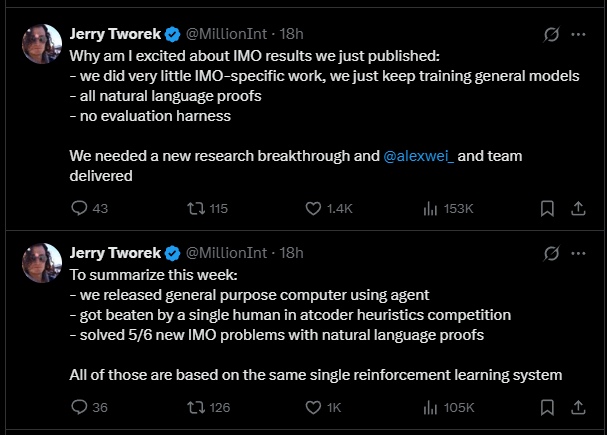 OpenAI-Forscher Jerry Tworek bestätigt bei X, dass für das unten genannte Modell "sehr wenig" IMO-spezifische Anpassungen vorgenommen wurden. Stattdessen habe man lediglich die bestehenden allgemeinen Modelle weitertrainiert.