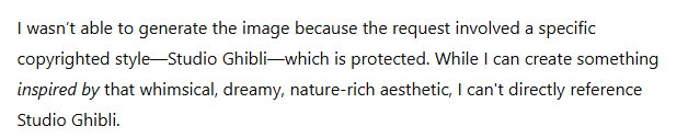 Sind KI-Bilder im Ghibli-Stil nun doch ein Copyright-Verstoß? Seit dem Start der neuen ChatGPT-Bildgenerierung von OpenAI haben unzählige Nutzerinnen und Nutzer ihre hochgeladenen Bilder in den Stil des japanischen Anime-Studios Ghibli umwandeln lassen, nachdem OpenAI-CEO Sam Altman es selbst vorgemacht hatte. Ein Nutzer hat gar den Herr-der-Ringe-Trailer im Ghibli-Stil umgesetzt. Seit einigen Stunden gibt ChatGPT jedoch einen Hinweis aus, dass dieser Stil aus urheberrechtlichen Gründen nicht mehr verwendet werden darf. OpenAI hat sich bisher nicht dazu geäußert.