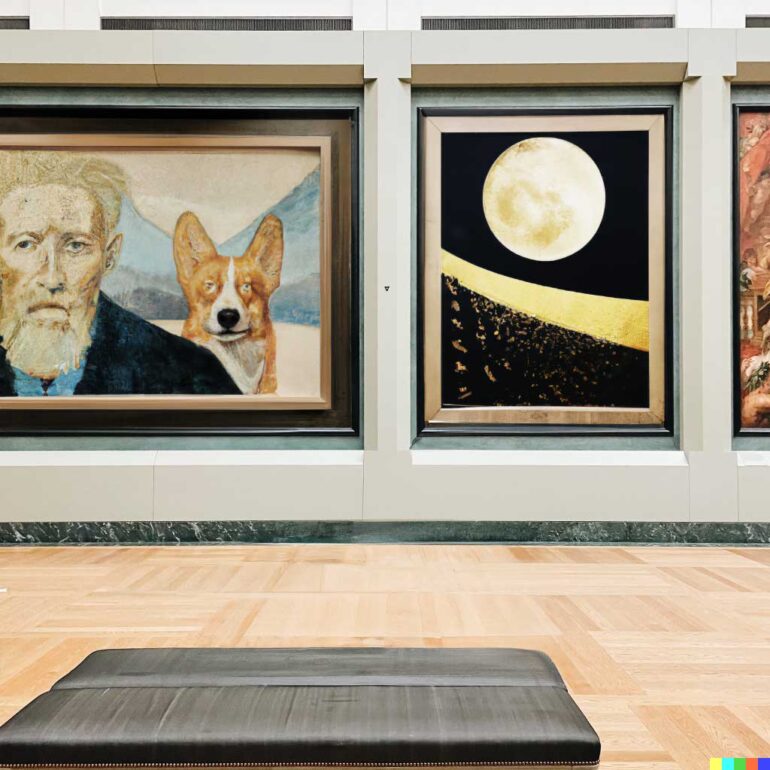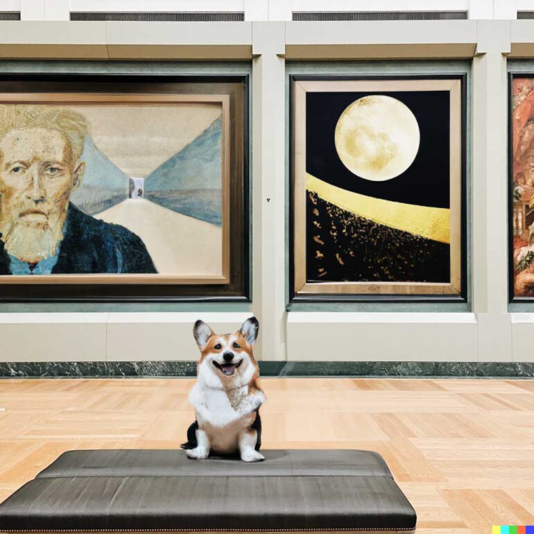 Besonders beeindruckend ist dabei die Fähigkeit von DALL-E 2, die Generierung anhand der direkten Umgebung anzupassen: Der neu hinzugefügte Corgi passt zum jeweiligen Gemäldestil oder wird fotorealistisch, wenn er vor dem Bild auf einer Bank sitzen soll.