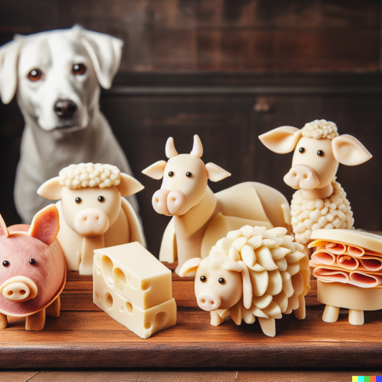 Das folgende Midjourney-Beispiel mit dem gleichen Prompt zeigt den Concept Spillover. Hier ist einerseits der Käse nicht zum Tier geworden, andererseits hat ein Hund Kuhhörner (aus Käse?) auf.