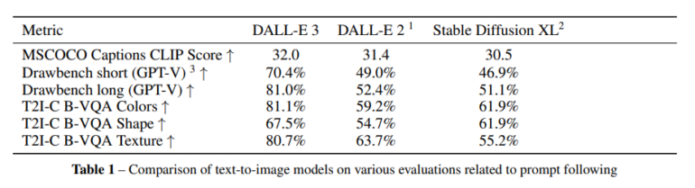 OpenAI testete die Prompt-Genauigkeit von DALL-E 3 in synthetischen Benchmarks und in Tests mit Menschen. In allen synthetischen Benchmarks liegt DALL-E 3 vor seinem Vorgänger DALL-E 2 und Stable Diffusion XL, meist mit deutlichem Abstand.
