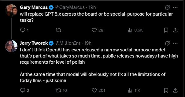 Auf eine Frage von OpenAI-Kritiker Gary Marcus, ob das Modell GPT-5.x vollständig ersetzen oder ein spezialisiertes System für bestimmte Aufgaben werden solle, antwortete Tworek, dass OpenAI bislang keine Modelle mit engem Einsatzzweck veröffentlicht habe. Das neue Modell werde zwar Fortschritte machen, aber "offensichtlich nicht alle Schwächen heutiger Sprachmodelle beseitigen" – aber immerhin "einige davon."