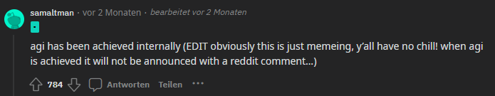 Möglicherweise bezog sich der OpenAI-Leaker "Jimmy Apples" auf Q-Star, als er Mitte September twitterte, dass "AGI intern erreicht wurde". OpenAI-Chef Sam Altman wiederholte diese Aussage sogar auf Reddit, korrigierte seine Nachricht aber später und fügte hinzu, dass "eine AGI natürlich nicht in einem Reddit-Kommentar angekündigt wurde" und er nur das Meme aufgegriffen habe.