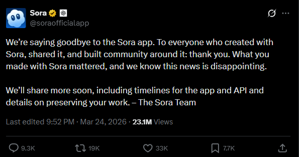 - OpenAI stellt seine KI-Video-App Sora samt API ein. Das Sora-Team bedankte sich bei der Community und kündigte weitere Details zu Zeitplänen und zur Sicherung erstellter Arbeiten an.