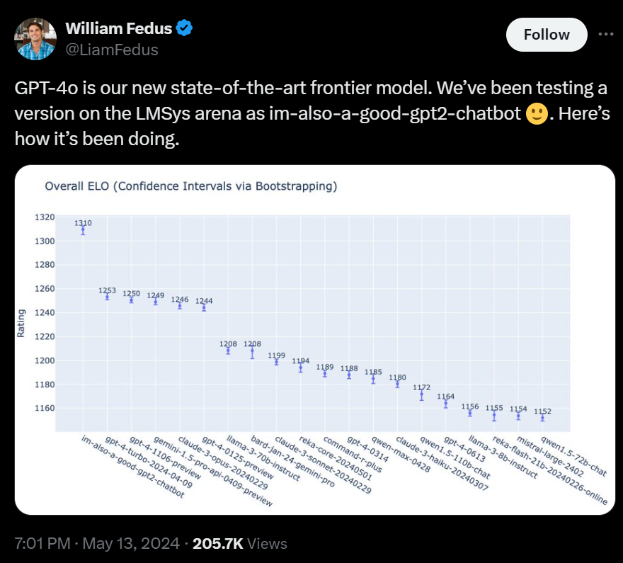 Um die Leistungsfähigkeit von GPT-4o zu demonstrieren, hat OpenAI das Modell in der LMSys Arena, einem Benchmark für Sprachmodelle, antreten lassen. Dabei übertraf es seinen Vorgänger GPT-4 Turbo um rund 60 ELO-Punkte. Die ELO-Bewertung wird derzeit als einer der wichtigsten Indikatoren für die Modellleistung angesehen, da die Bewertung im Blindtest von Menschen anhand der tatsächlichen Ausgaben des Modells vorgenommen wird.