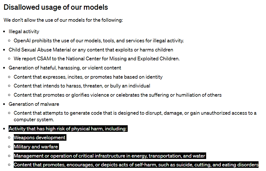 Die frühere Richtlinie verbot ausdrücklich die Durchführung von Aktivitäten mit OpenAI-Technologien und ChatGPT, die ein hohes Risiko für die körperliche Unversehrtheit darstellen, einschließlich der Entwicklung von Waffen und der militärischen Kriegsführung.