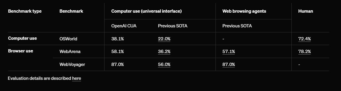 Im WebVoyager-Benchmark, der die Leistung auf realen Websites wie Amazon, GitHub und Google Maps misst, liegt die Erfolgsrate bei 87 Prozent. Bei komplexeren Aufgaben im OSWorld-Benchmark erreicht CUA 38,1 Prozent. Hier werden dem System komplexe Aufgaben gestellt, wie das automatische Kombinieren von PDFs aus einer E-Mail. Mehr Beispiele und Klickstrecken des Agenten gibt es hier.