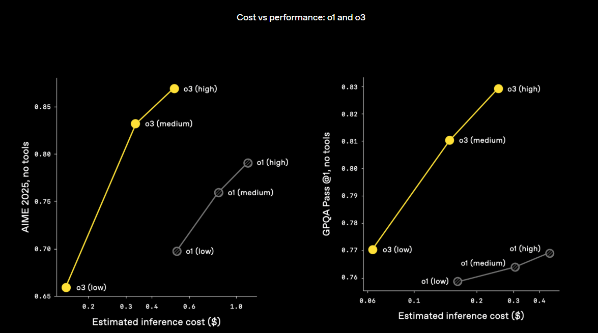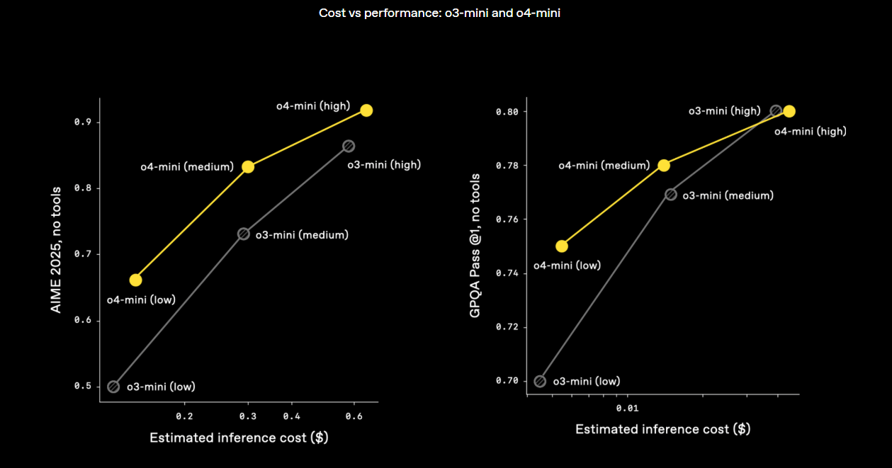 Für das Reinforcement Learning und Schlussfolgerungen während des "Denkvorgangs" hat OpenAI laut eigenen Angaben die Rechenleistung um eine Größenordnung gesteigert und sehe weiterhin Leistungssteigerungen. Dennoch sollen o3 und o4-mini oft nicht nur intelligenter, sondern auch kosteneffizienter als ihre Vorgänger o1 und o3-mini sein.