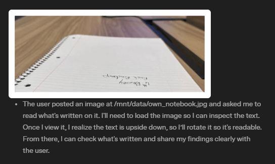 In einem Beispiel zeigt OpenAI, wie das KI-Modell eine auf der Kopf stehende unleserliche Handschrift einzoomt, das Bild umdreht und dann korrekt transkribiert.
