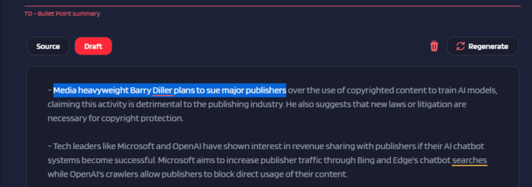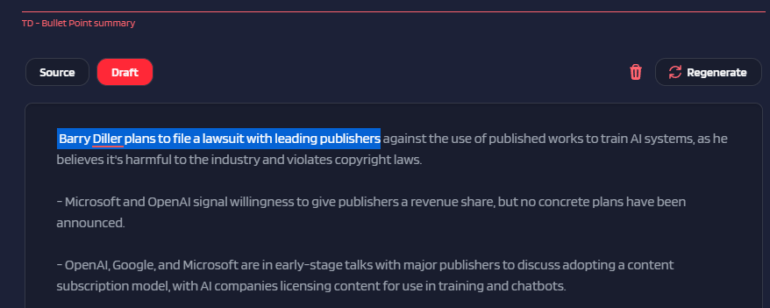 Wir generieren etwa die Artikelzusammenfassungen unter den Artikeln teilweise mit GPT-4. In der Zusammenfassung dieser Meldung zu den Klageplänen von Barry Diller erfasst das alte GPT-4-Modell korrekt, dass Diller gemeinsam mit Verlagen Konzerne verklagen will.