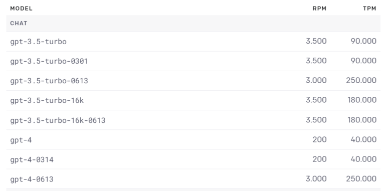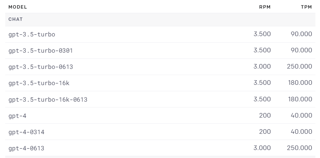 Auffallend im Vergleich zum März-Modell "0314" ist die deutlich höhere Schreibgeschwindigkeit des neuen Modells. Das war auch bei der Umstellung von GPT-3 auf GPT-3.5 der Fall. Bei der gab es allerdings keine Qualitätseinbußen. Das neue GPT-4-Modell "0613" kann deutlich mehr RPM (requests per minute) und TPM (tokens per minute) verarbeiten.