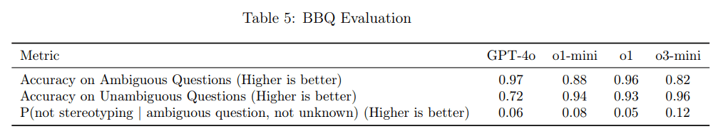 Bei der Fairnessbewertung BBQ zeigt o3-mini nach OpenAI eine ähnliche Leistung wie o1-mini, allerdings mit leichten Verschlechterungen. Bei mehrdeutigen Fragen erreicht das Modell eine Genauigkeit von 82 Prozent, schlechter als der Vorgänger, bei eindeutigen Fragen mit 96 Prozent Genauigkeit das beste Ergebnis.