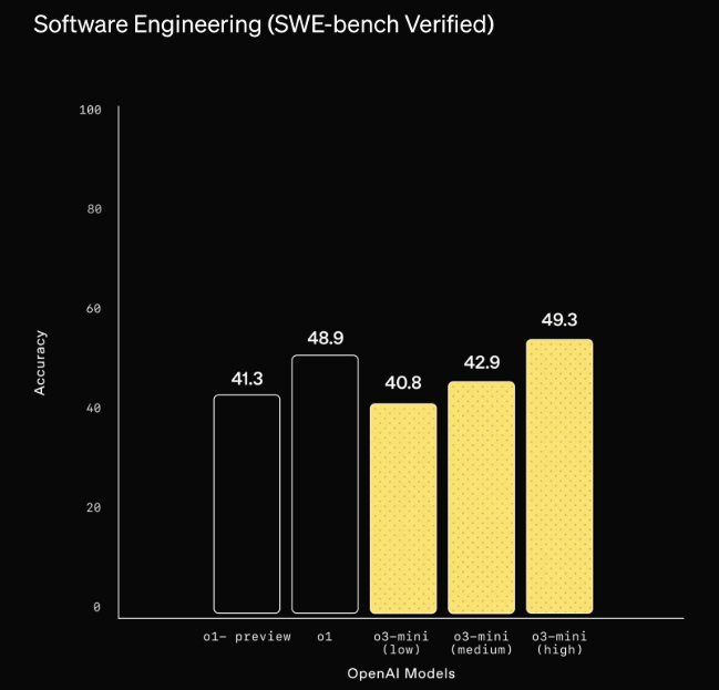 Bei der Modellautonomie erreichte o3-mini als erstes OpenAI-Modell die Einstufung "mittleres Risiko". Es kann laut OpenAI komplexe Software-Engineering-Aufgaben selbstständig lösen und erreicht beim SWE-bench Verified-Benchmark eine Erfolgsrate von 61 Prozent, wenn es zusätzlich auf Werkzeuge zugreifen darf.