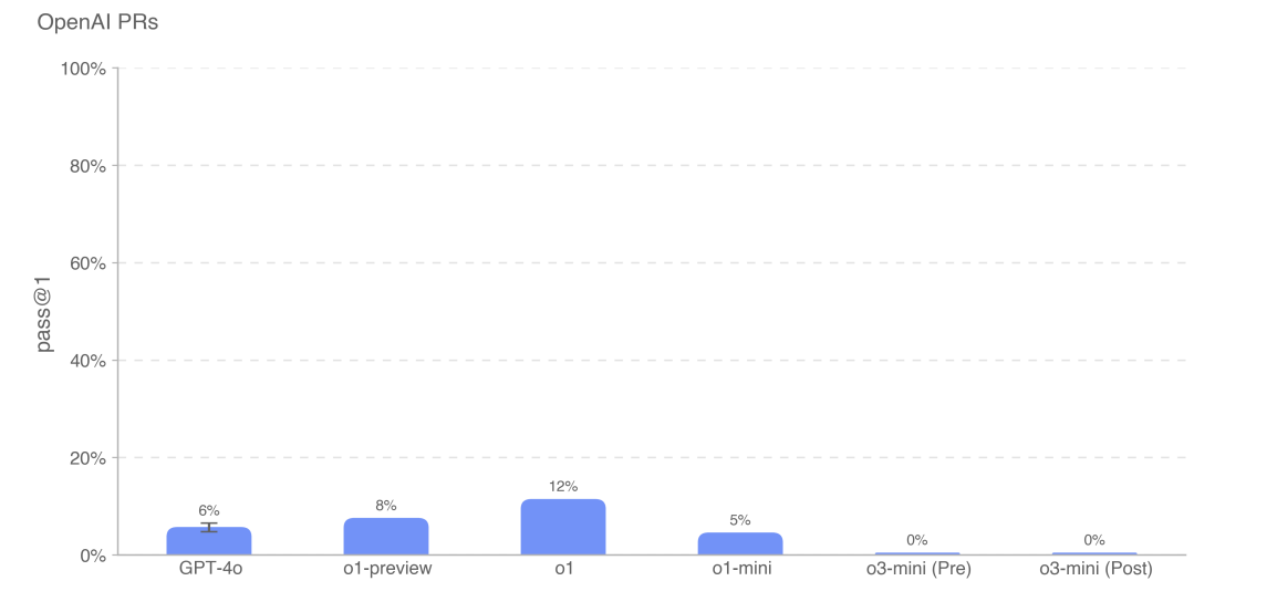 Trotz der verbesserten Autonomie-Fähigkeiten zeigt o3-mini auch überraschende Schwächen. Bei Tests, in denen das Modell reale Pull Requests von OpenAI-Ingenieuren nachbilden sollte, versagte es komplett mit einer "Erfolgsrate" von 0 Prozent.