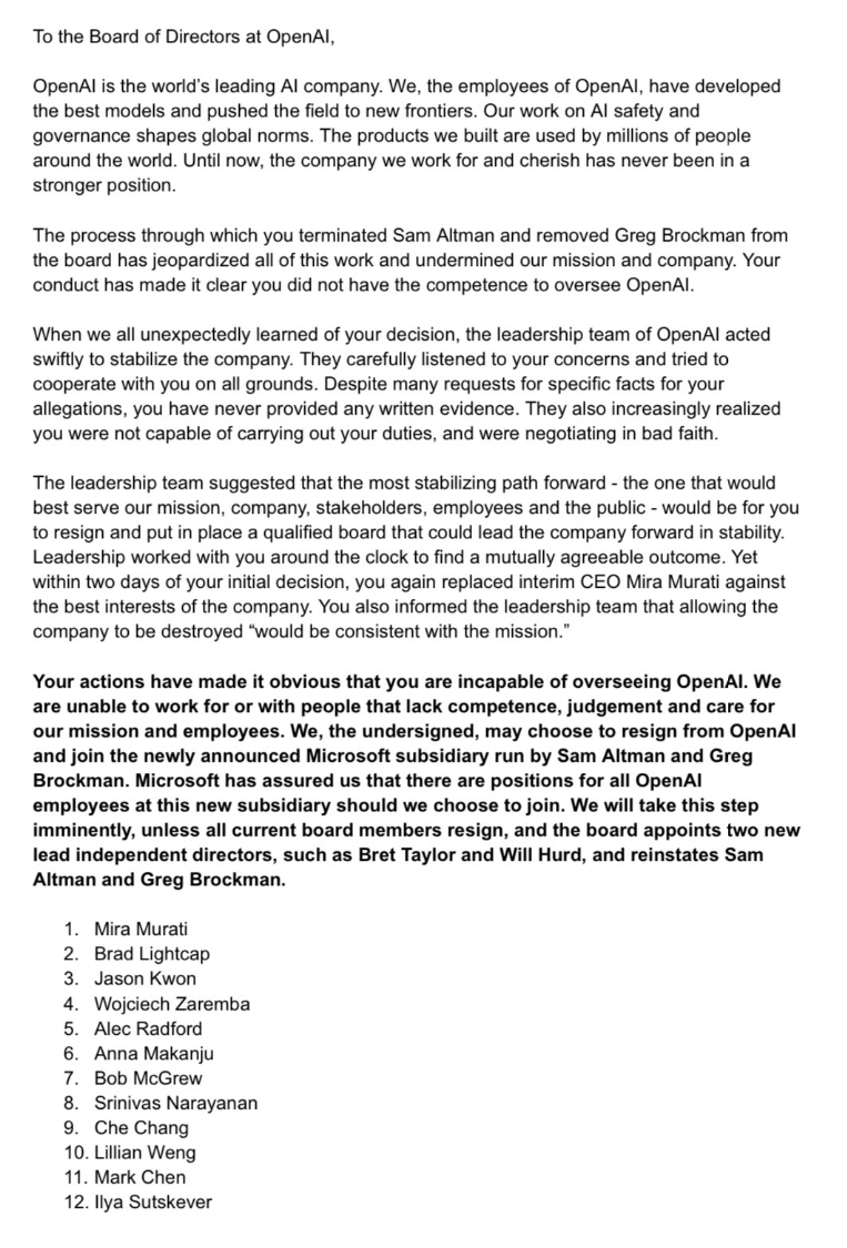 Unterzeichnet ist der Brief von zahlreichen Vorstandsmitgliedern, darunter die bisherige CTO Mira Murati, die für knapp zwei Tage als Interims-CEO für Sam Altman fungieren durfte, COO Brad Lightcap und Mitgründer John Schulman.