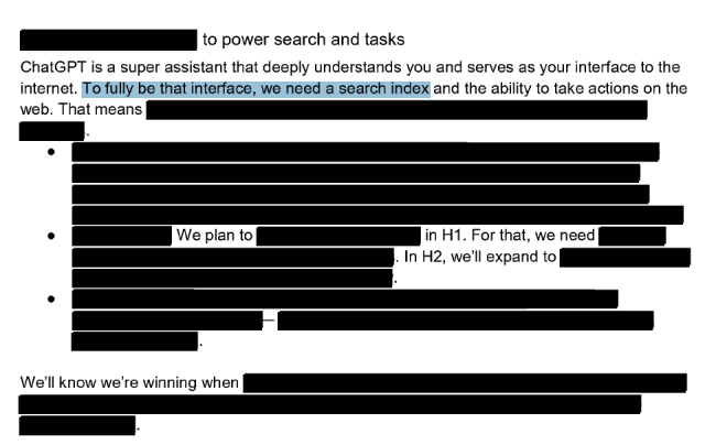 Ein zentraler Baustein der Strategie scheint die Entwicklung eines eigenen Suchindex zu sein. Das Dokument stellt klar: "Um vollständig dieses Interface zu sein, benötigen wir einen Suchindex und die Fähigkeit, Aktionen im Web auszuführen." OpenAI könnte planen, dies in der ersten Jahreshälfte 2025 umzusetzen und in der zweiten Jahreshälfte zu erweitern, allerdings sind hier weite Teile ausgeschwärzt.