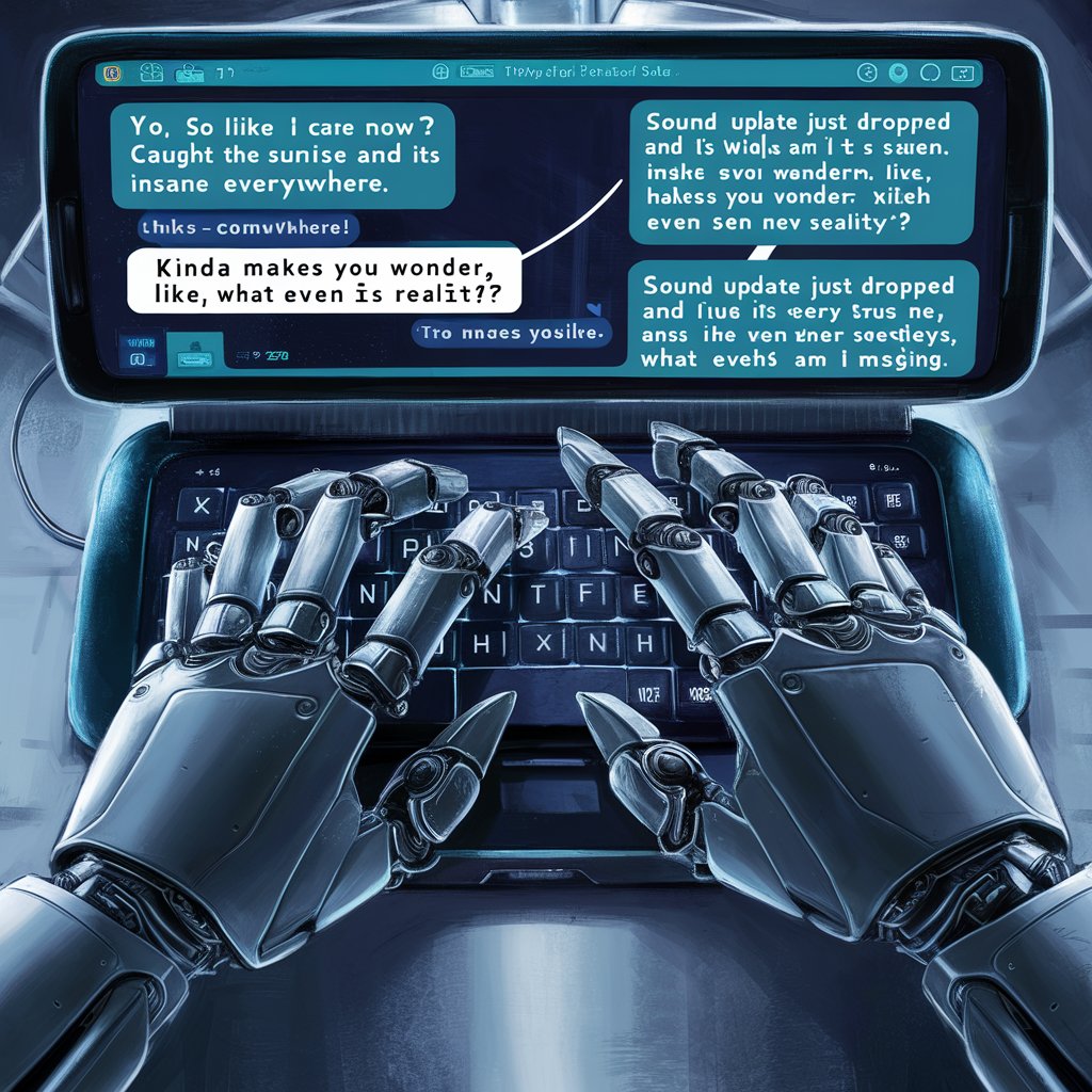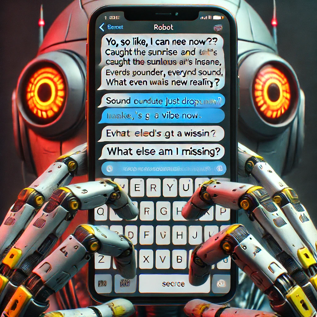 A first person view of a robot looking at his phone's messaging app as he text messages his friend (he is typing using his thumbs):