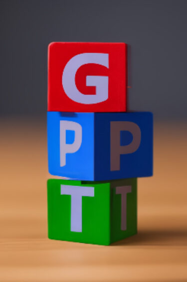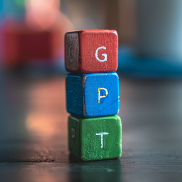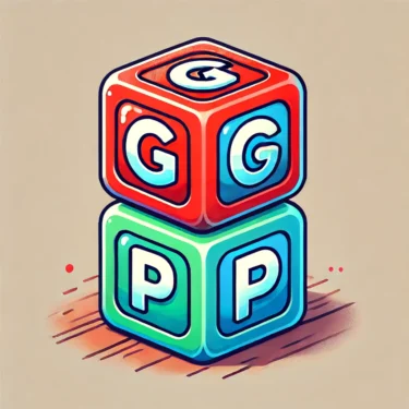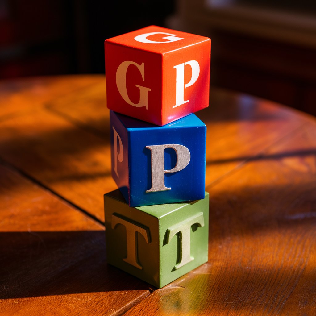 An image depicting three cubes stacked on a table. The top cube is red and has a G on it. The middle cube is blue and has a P on it. The bottom cube is green and has a T on it. The cubes are stacked on top of each other.