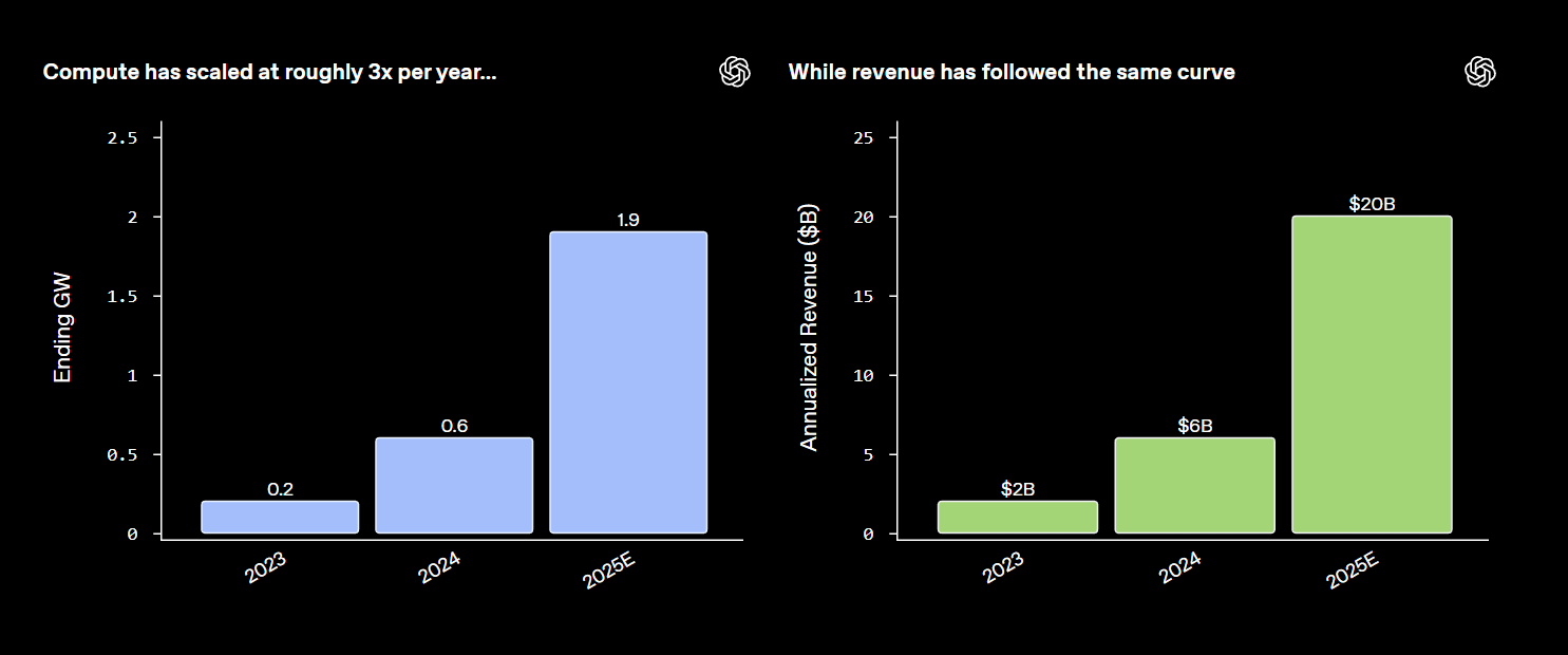 OpenAI hat Geschäftszahlen veröffentlicht. Die Rechenkapazität (Compute) stieg von 0,2 Gigawatt im Jahr 2023 auf 0,6 Gigawatt im Jahr 2024 und erreicht 2025 voraussichtlich 1,9 Gigawatt, eine Verdreifachung pro Jahr. Der Umsatz folgt einer ähnlichen Wachstumskurve: von 2 Milliarden Dollar im Jahr 2023 über 6 Milliarden Dollar im Jahr 2024 auf mehr als 20 Milliarden Dollar im Jahr 2025. Das entspricht einer Verzehnfachung innerhalb von zwei Jahren. OpenAI-Finanzchefin Sarah Friar leitet daraus das Geschäftsmodell ab: mehr Compute führt zu mehr Umsatz. Auch CEO Sam Altman vertritt diese These. Ob das tatsächlich so ist, werden die nächsten Monate zeigen.