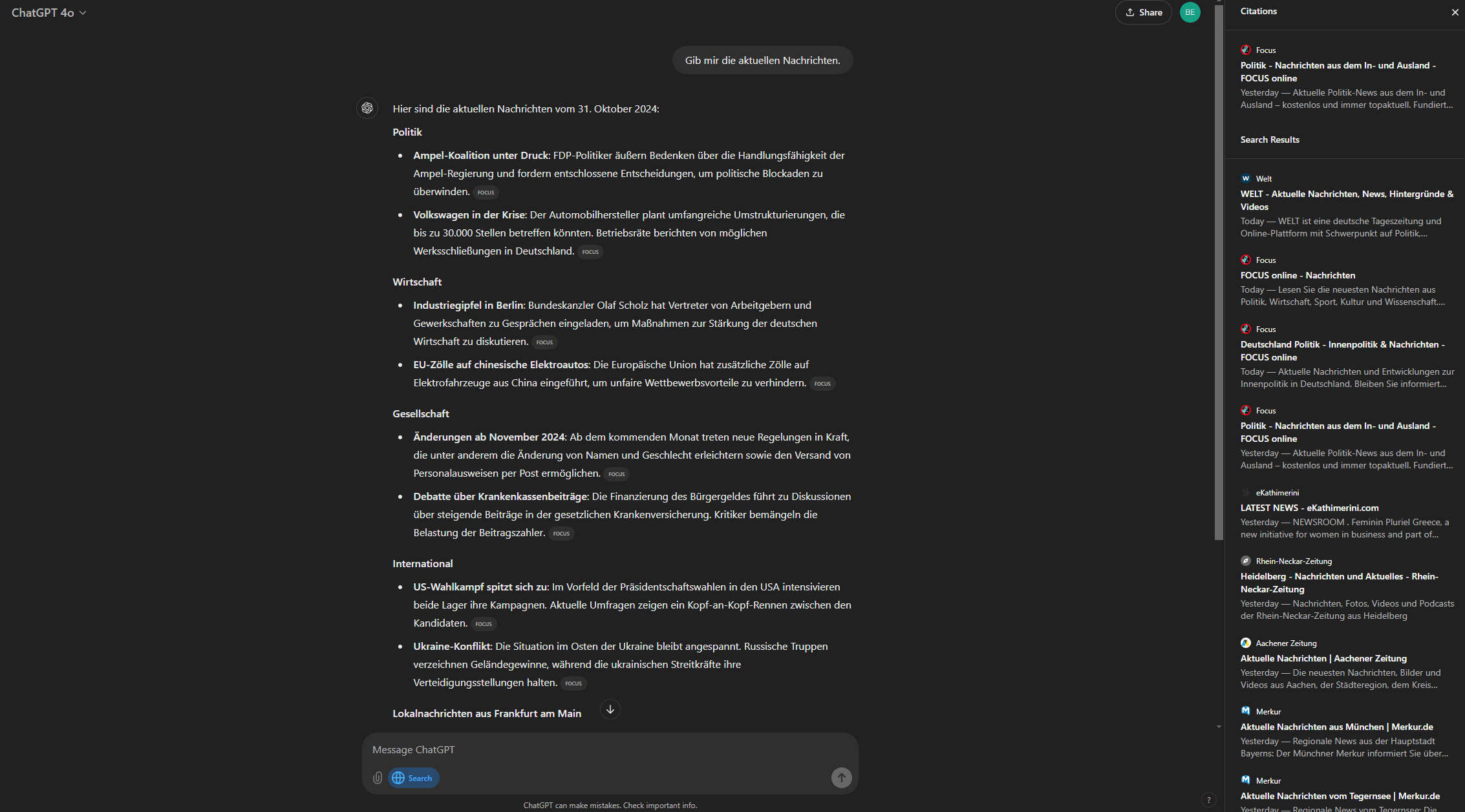 Für aktuelle Nachrichten hat OpenAI Partnerschaften mit ausgewählten Medienunternehmen geschlossen, darunter Associated Press, Axel Springer, Financial Times, Reuters und Vox Media. In Deutschland führt das derzeit dazu, dass bei Nachrichtensuchen vorwiegend Springer-Medien wie Bild und Welt angezeigt werden.