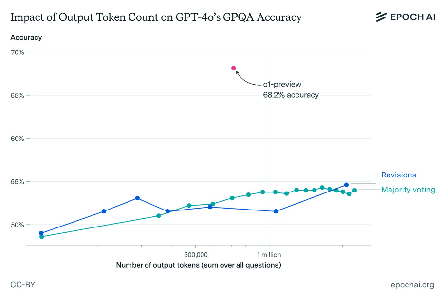 Forscher von Epoch AI haben nun versucht, die Leistung von o1-preview in einem anspruchsvollen Multiple-Choice-Benchmark mit naturwissenschaftlichen Fragen (GPQA) zu erreichen, indem sie eine große Anzahl von Token mit GPT-4o unter Verwendung von zwei Prompting-Methoden (Revisions und Majority Voting) generierten, ähnlich wie es o1 in seinem "Denkprozess" tut.