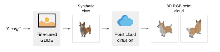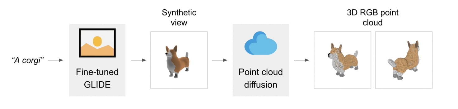 Point-E besteht selbst aus zwei Modellen: einem GLIDE- und einem Bild-zu-3D-Modell. Ersteres ähnelt Systemen wie DALL-E oder Stable Diffusion und kann aus Text-Beschreibungen Bilder generieren.