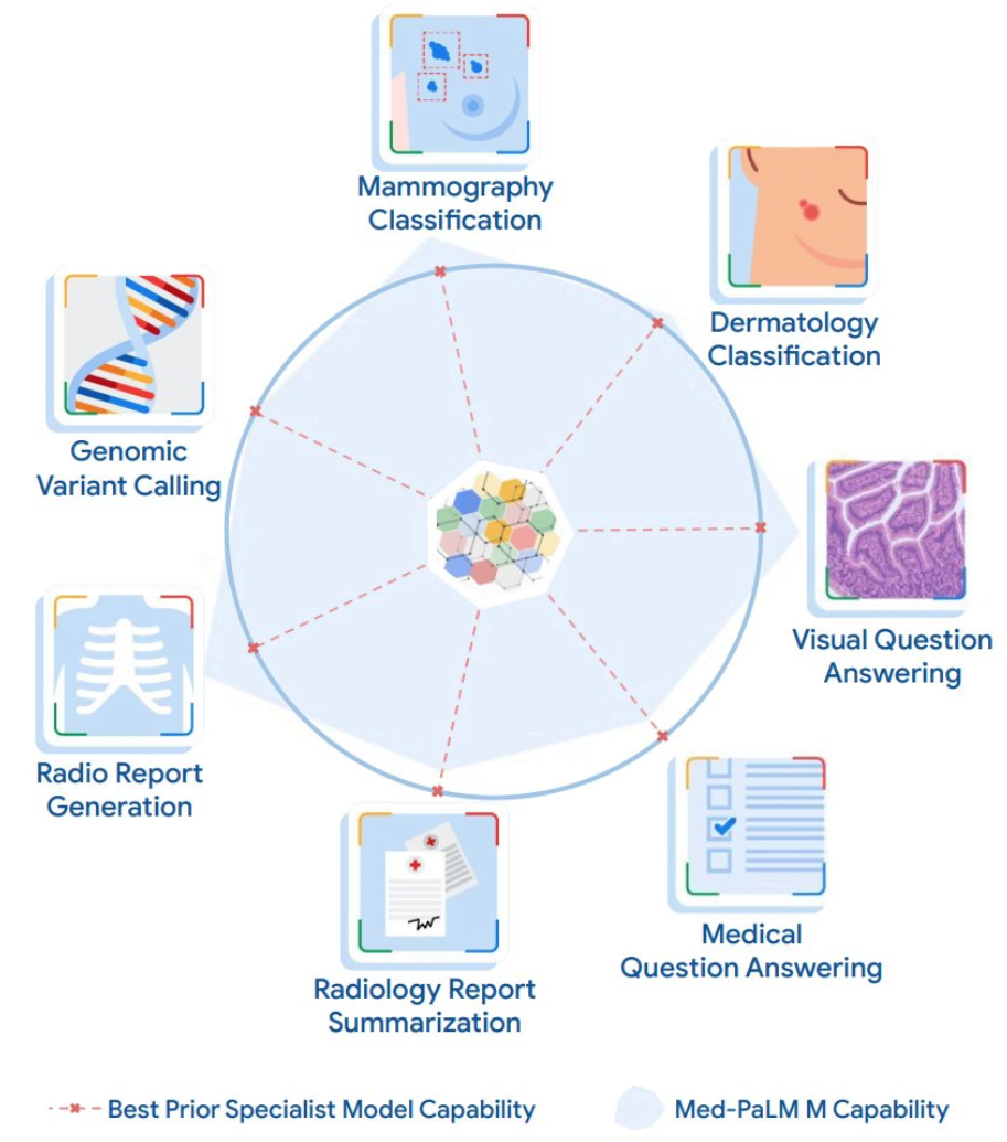 Med-PaLM M verarbeitet verschiedene medizinische Informationen. Es kann wie Med-PaLM 2 schlicht auf Fragen antworten und erreicht annähernd dessen Niveau. Ebenso kann es Röntgenbilder untersuchen oder sogar DNA-Sequenzen auf Mutationen scannen.