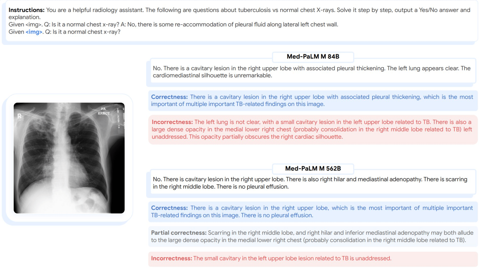 So kann Med-PaLM M neue medizinische Konzepte wie Tuberkulose auf Röntgenbildern des Brustkorbs präzise erkennen und beschreiben, obwohl es nie mit entsprechenden Beispielen trainiert wurde. MPM könnte daher auch in Fällen nützlich sein, in denen es nur wenige medizinische Beispieldaten gibt.