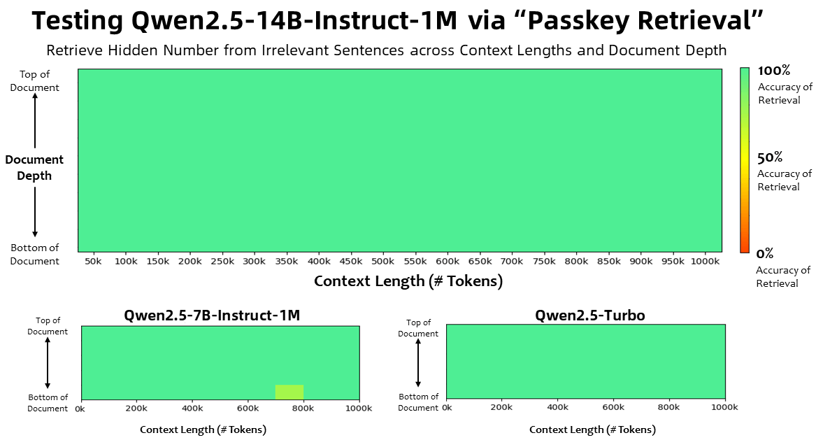 Die Qwen2.5-1M-Modelle wurden in verschiedenen Benchmarks für Aufgaben mit bis zu einer Million Token Kontext getestet. In einem Benchmark, bei dem versteckte Zahlen aus extrem langen Dokumenten abgerufen werden mussten, erzielten sowohl Qwen2.5-14B-Instruct-1M als auch Qwen2.5-Turbo zuvor eine Genauigkeit von 100 Prozent.