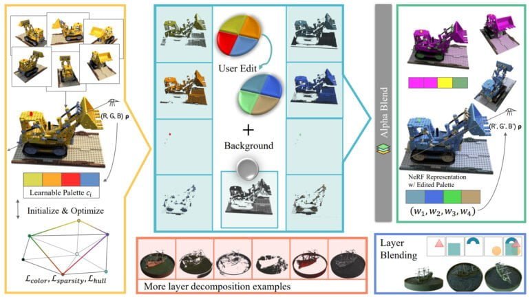 RecolorNeRF ist nach Angaben des Teams der erste Ansatz, der fotorealistische NeRFs direkt und in hoher Qualität verändern kann. Dazu zerlegen die Forscherinnen und Forscher die Szene in verschiedene Schichten auf einer gelernten Farbpalette, die sie dann verändern können. So bearbeiten sie das NeRF direkt und können die Szene anschließend wie gewohnt rendern.