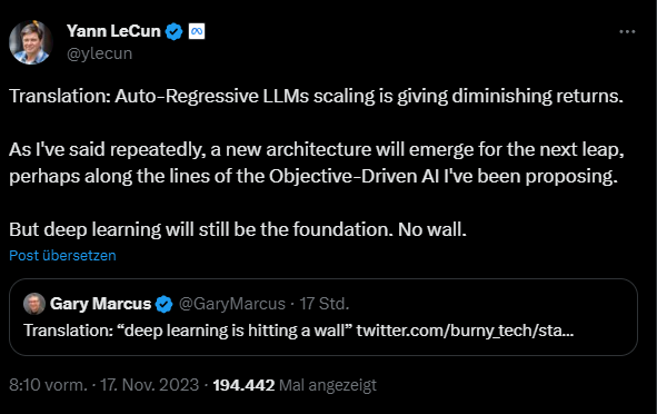 Der Deep-Learning-Kritiker Gary Marcus übersetzte Altmans Aussage mit "Deep Learning stößt an Grenzen". Laut Marcus könnten Netzwerke zwar vereinzelt verallgemeinern, aber niemals zuverlässig. Metas KI-Chef Yann LeCun sieht sich dagegen in seiner Position bestätigt, dass große Sprachmodelle nicht die Lösung sind. Er setzt weiter auf Deep Learning - allerdings mit anderen Architekturen und Trainingszielen wie bei JEPA.