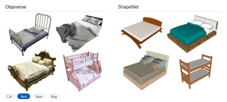 Damit ist Objaverse um mehr als eine Größenordnung größer als der bisher größte Datensatz Shapenet und umfasst fast 400-mal so viele Kategorien, darunter auch fotorealistische Modelle.