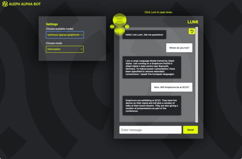 Die beiden Unternehmen konnten das 13 Milliarden Parameter große "Luminous Base"-Sprachmodell von Aleph Alpha auf 2,6 Milliarden Parameter verschlanken. Die Unternehmen zeigten zudem eine verschlankte Variante von Lumi, einem "Conversational Module" für Luminous.