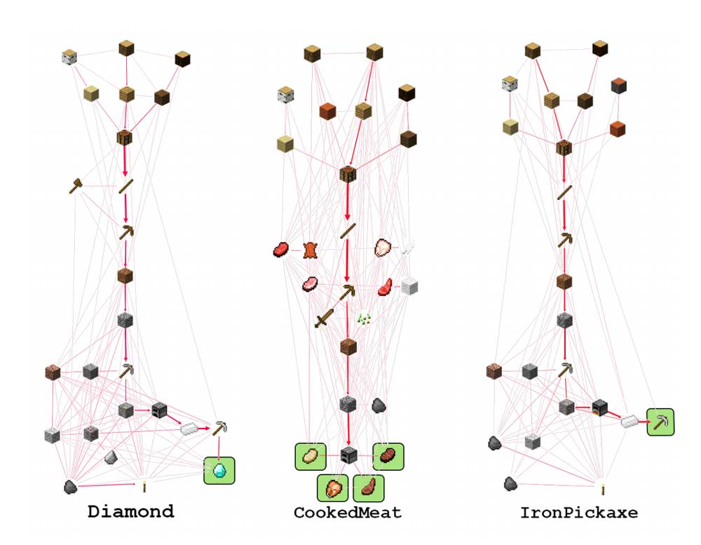 Im Spiel muss die KI sechs Aufgaben lösen: navigieren, sich Holz, Bett, Fleisch und Spitzhacke besorgen und am Ende einen Diamanten ausbuddeln. Diese Aufgaben bauen aufeinander auf: ohne Holz keine Spitzhacke, ohne Hacke kein Diamant.