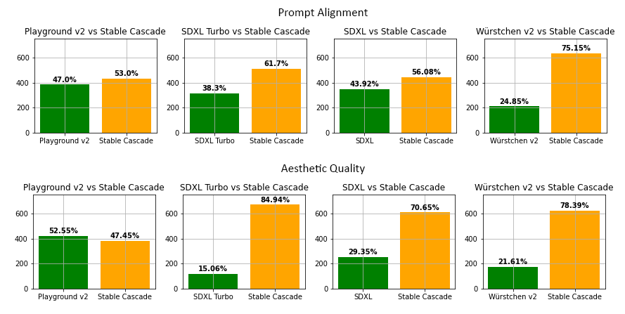 Laut Stability AI übertrifft Stable Cascade in den meisten Modellvergleichen andere Modelle in Bezug auf Prompt-Umsetzung und ästhetische Qualität.