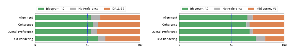 In Vergleichstests hätten Benutzerinnen und Benutzer mit Ideogram erzeugte Bilder in allen Bereichen besser bewertet als mit DALL-E 3 und Midjourney v6 erzeugte Bilder.