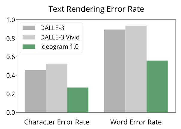 Das Unternehmen behauptet, dass Ideogram 1.0 die Textfehlerrate im Vergleich zu DALL-E 3 um fast die Hälfte reduziert. Midjourney ist bei der Textdarstellung noch schwächer als DALL-E 3.