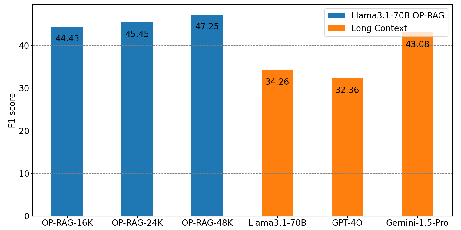 Die Forschenden bewerteten ihren OP-RAG-Ansatz anhand der En.QA- und En.MC-Datensätze des ∞Bench-Benchmarks. Dieser ist speziell für Frage-Antwort-Aufgaben mit langem Kontext konzipiert. Sie fanden heraus, dass OP-RAG mit dem LLaMA-3.1-70B-Modell einen F1-Score von 44,43 erreichte, während nur 16.000 abgerufene Token verwendet wurden.