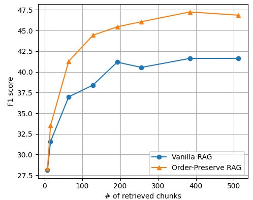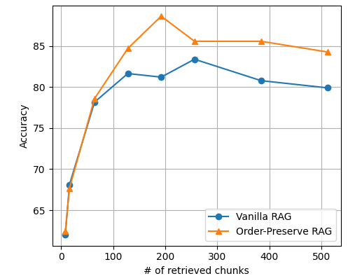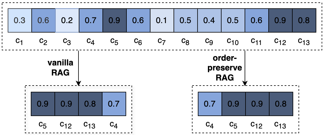 Das Paper "In Defense of RAG in the Era of Long-Context Language Models" schlägt konkret einen reihenfolgeerhaltenden RAG-Ansatz (OP-RAG, OP steht für order-preserving) vor, der die ursprüngliche Reihenfolge der abgerufenen Teile (Chunks) im LLM-Kontext beibehält. Dies steht im Gegensatz zu herkömmlichen RAG-Methoden, die die Chunks meist nach absteigender Relevanz anordnen.