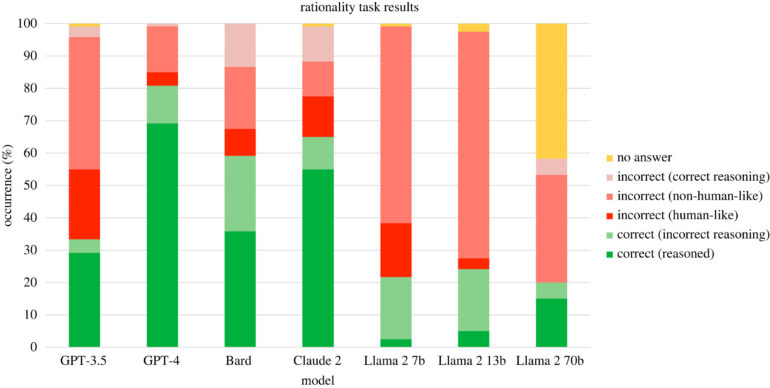 Laut der Studie war das Modell GPT-4 von OpenAI am menschenähnlichsten in seinen Antworten auf die kognitiven Aufgaben. GPT-4 gab in 73,3% der Fälle menschenähnliche Antworten (sowohl richtige als auch falsche).
