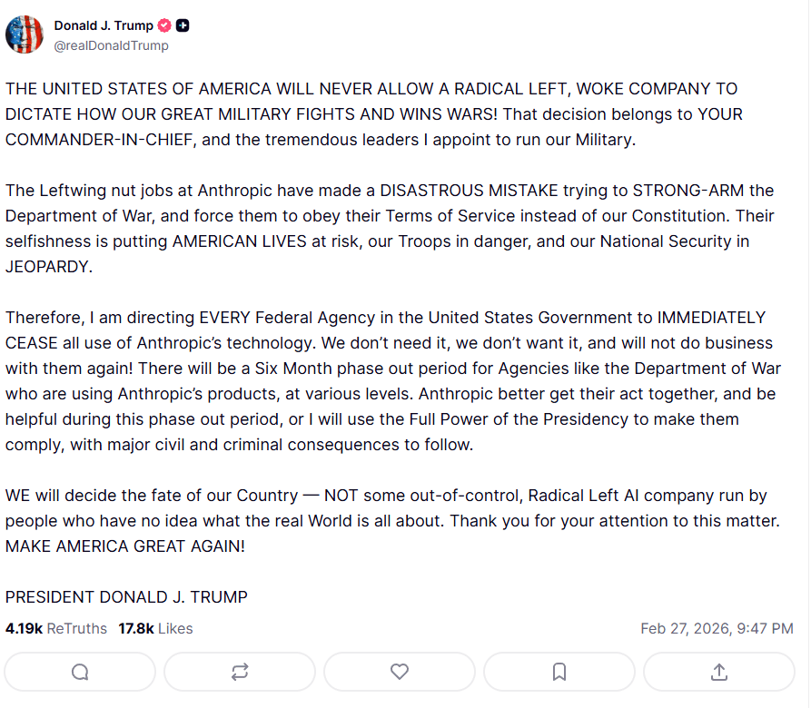 Die Frist des Pentagons ist verstrichen und Anthropic hat nicht klein beigegeben. Entsprechend setzt US-Präsident Donald Trump zu einer Wutrede an: In einem Post auf Truth Social ordnet er alle US-Bundesbehörden an, die Nutzung von Anthropics Technologie sofort einzustellen.