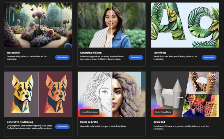 Zusätzlich gibt es eine neue Weboberfläche unter firefly.adobe.com mit dem Text-zu-Bild-Generator, Generative Fill, Generativer Neufärbung, Texteffekten und 3D zu Bild.