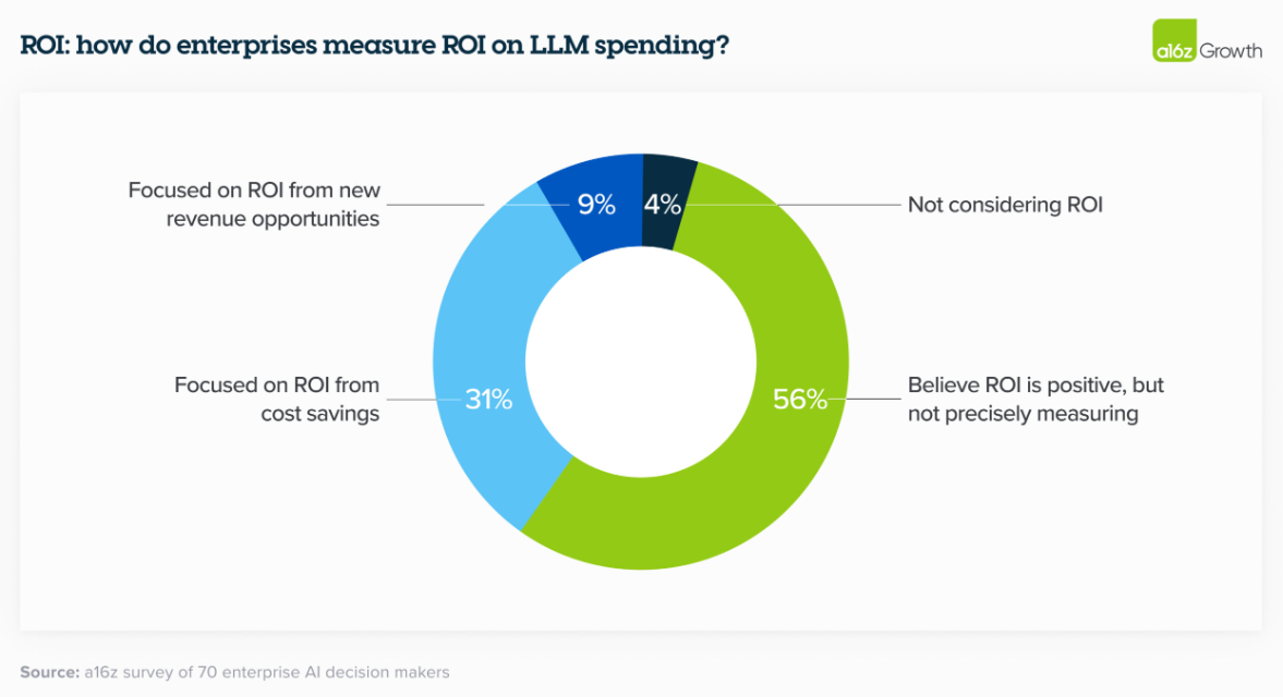 Produktivitätssteigerungen werden als positiver Indikator gewertet, berichtet a16z, doch suchen die Verantwortlichen nach konkreteren Metriken wie Umsatzsteigerungen, Kosteneinsparungen, Effizienzgewinnen und Genauigkeitswerten - je nach KI-Anwendungsfall.