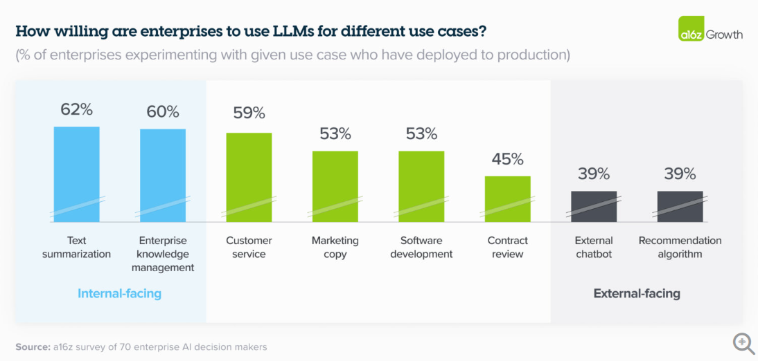 Dem Bericht zufolge konzentrieren sich die Unternehmen darauf, beliebte KI-Anwendungen wie Chatbots intern zu entwickeln, anstatt Lösungen auf dem Markt einzukaufen. Die beliebtesten Anwendungen sind nach wie vor auf die interne Produktivität ausgerichtet.