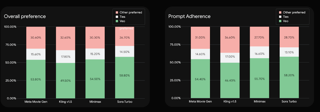 In direkten Vergleichstests mit menschlichen Bewertern wurden 1003 Prompts aus dem MovieGenBench-Datensatz von Meta evaluiert. Die Tests erfolgten mit Videos in 720p-Auflösung, wobei Veo 2 acht Sekunden lange Clips erzeugte. Hier schneidet Veo 2 in der Gesamtbewertung und beim Prompt-Following besser ab als der Wettbewerb, auch im Vergleich zu OpenAIs Sora Turbo.