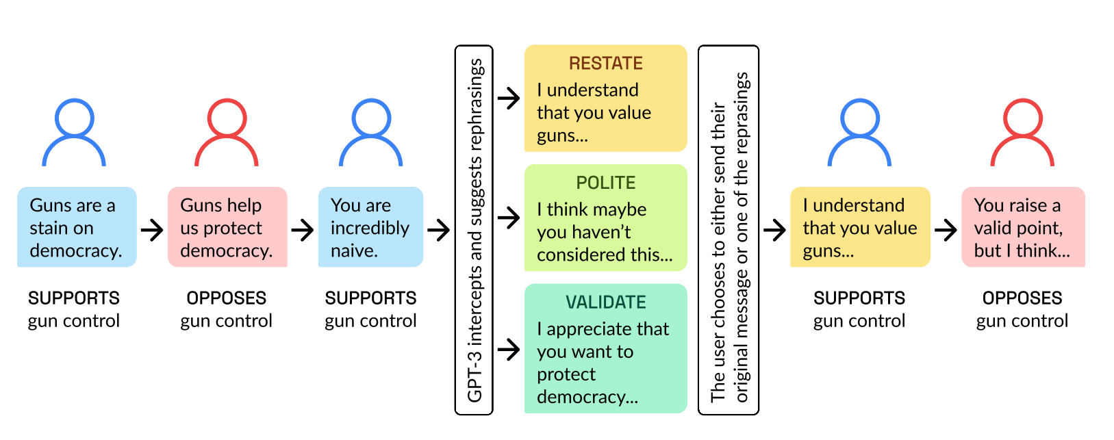 Ein großes Sprachmodell (GPT-3) liest die Konversationen mit und schlägt jeder Probandin und jedem Probanden vor dem Abschicken einer Nachricht eine alternative Formulierung vor. Der Vorschlag zielt darauf ab, die Nachricht freundlicher, wertschätzender und höflicher zu formulieren.